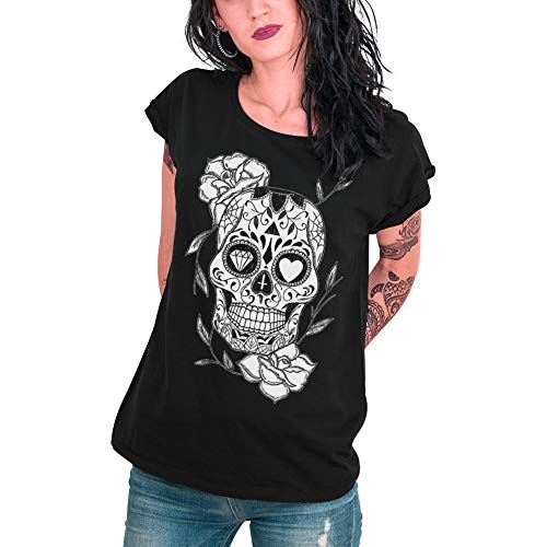 VIENTO Mexican Skull Camiseta para Mujer (Negro, M)