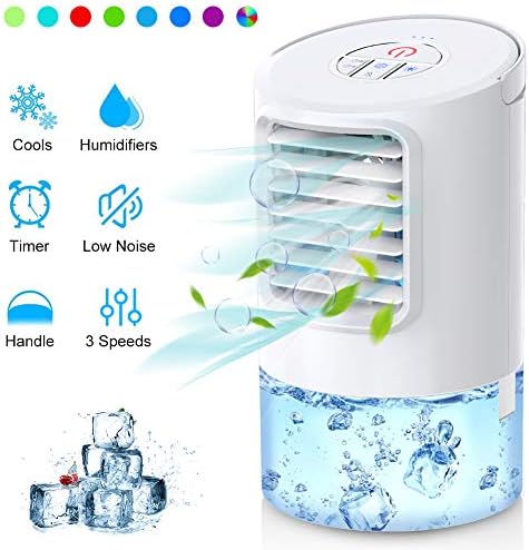 Mini Enfriador de Aire, Mini Acondicionador de Aire Móvil, 4 en 1 Climatizadores Evaporativos con Función de Humidificación, 2 Temporizadores/3 Niveles de Potencia/7 Colores Luz, Perfecto Regalo